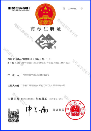 近日,廣州恒星制冷設備集團有限公司收到國家知識產權局頒發(fā)的恒星組合式商標注冊證。本次商標注冊申請為“恒星+HSTARS+圖形(星星)”組合。使用產品/服務項目(國際分類:11)涵蓋5大類,標志著廣州恒星制冷設備集團有限公司在品牌建設方面取得了里程碑的成果。
